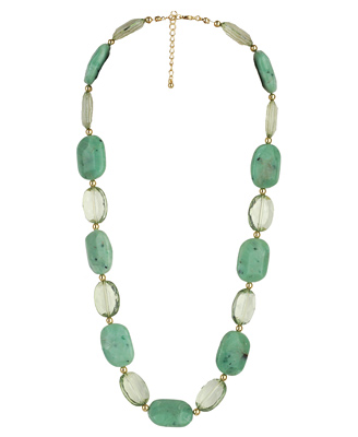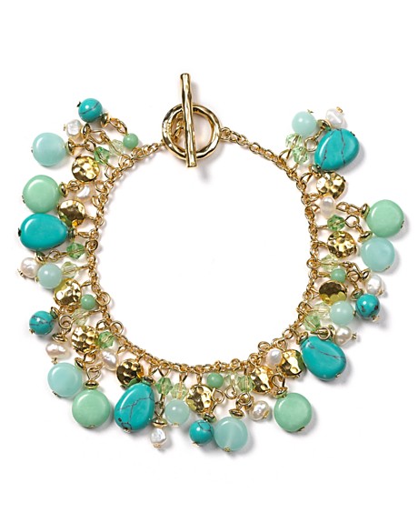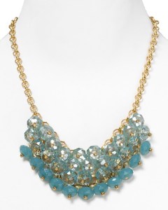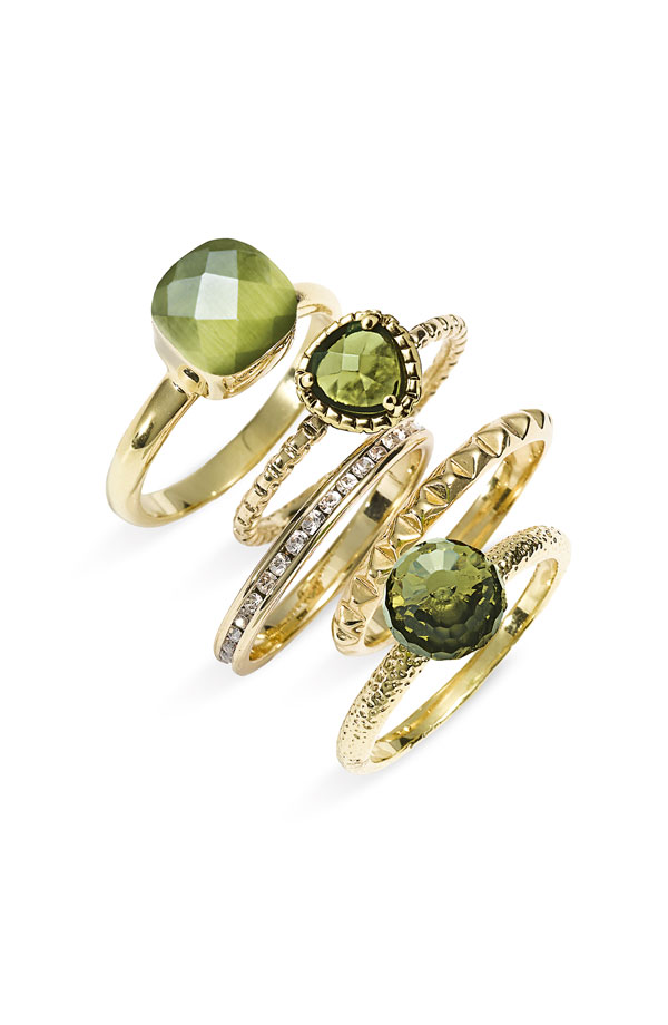 Stackable ring set in green($68) and Kate Spade stud earring in aqua($38) both available at Nordstrom. Aqua cluster bib style necklace($35), Lauren by Ralph Lauren multi bead 3 strand necklace($68) and Lauren by Ralph Lauren charm bracelet($48) all available at Bloomingdale’s. Green gem necklace($6.80), wooden bracelet in blue ($6.80) and painted leaf earring($3.80) all available at Forever21. Kate Spade chandelier earring in aqua($98) and Ippolita 18k gold ring with diamond accent($3,295) both available at Saks. Serenity necklace with Large jade and glass pieces($198) and small stone drop earring in aqua($34) both available at stella & Dot. Gold multi stone cuff($24.99) and gold cuff with wired agate ($24.99) both available at Target.