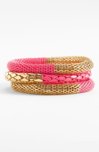 Earring trio set ($8.70) and cube earrings ($17.40) both available at Asos. High-low dress ($19.80) and hair pin set ($2.80) both available at Forever21. Orange sandal ($19.99) available at Target. Pink dipped mesh bangles, set of 3 ($14) and floral fedora ($12.90) both available at Nordstrom.