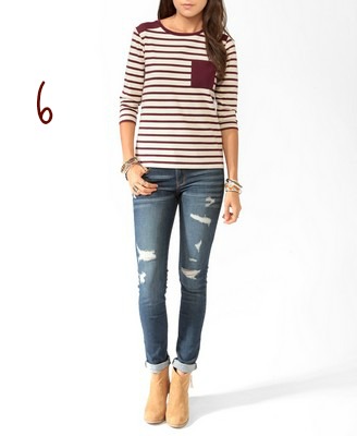 4.Grey skinny jeans, short length($13.50) 5. Black shift dress($19.80) 6. Striped 3/4 length top($14.80) all available at Forever21.