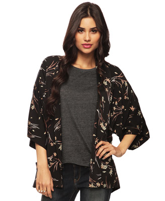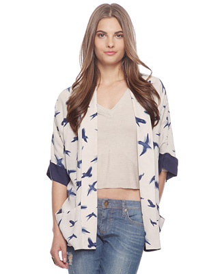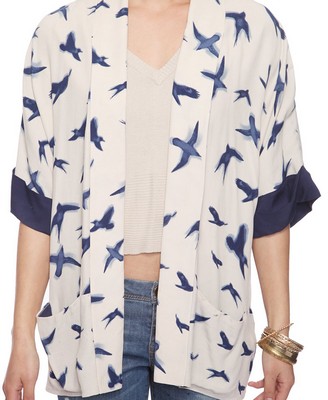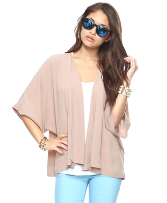Black & brown kimono cardigan($13.99), solid blush kimono cardigan($13.50), Bird kimono cardigan($27.80) and cream floral kimono cardigan($24.80) all available at Forever21.