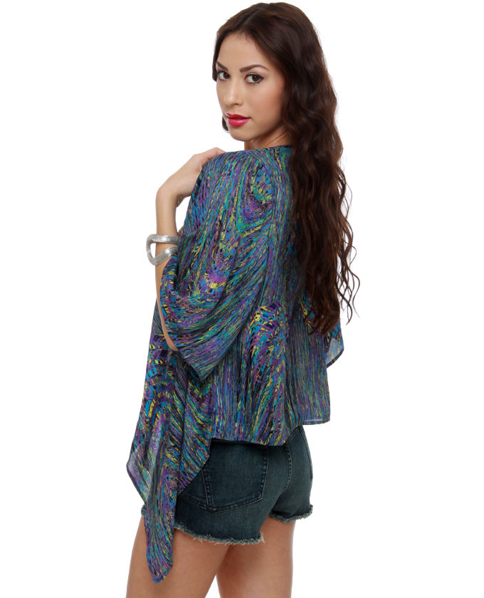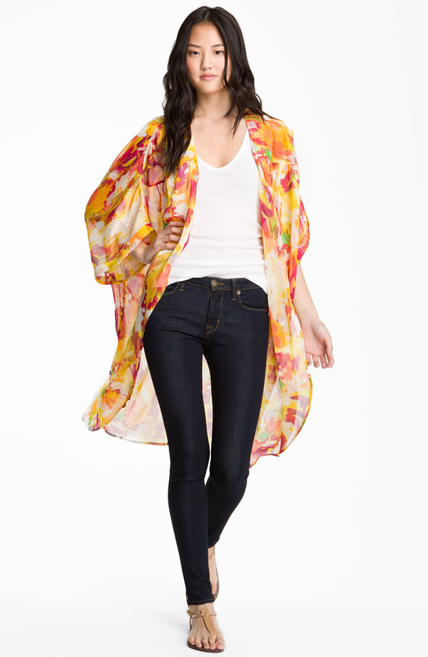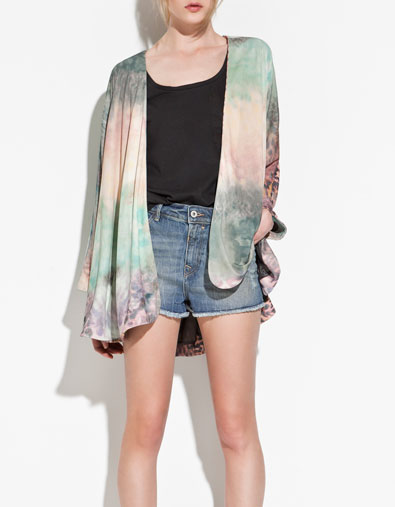 Yellow floral Kimono cape($88) available at Nordstrom. Blue printed kimono cardigan($35) available at Lulu’s. Tie dye inspired kimono cardigan($79.90) available at Zara. Black floral with solid trim kimono cardigan in Plus size($24.99) available at Target.