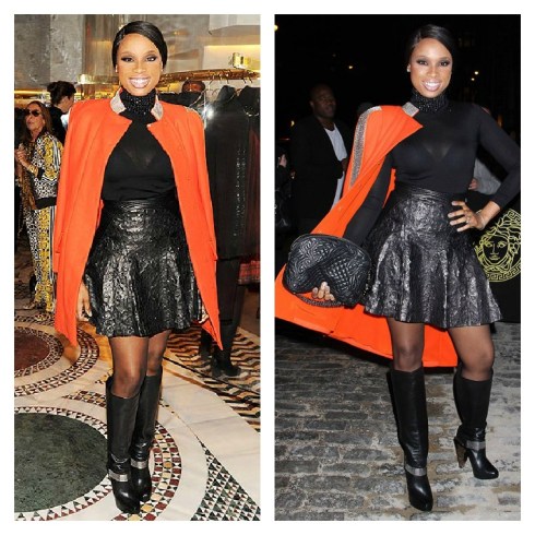 Love this look on Jennifer Hudson!  All black topped with a bright cape!