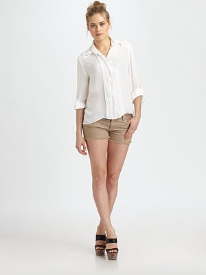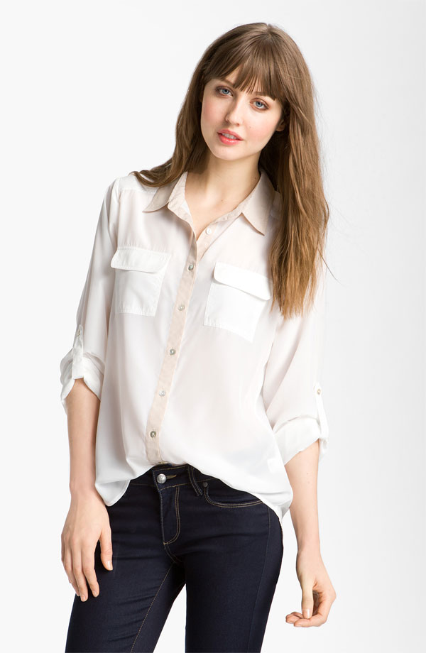Blouse with sand colored trim pictured partially tucked into blue jeans($78) available at Nordstrom.