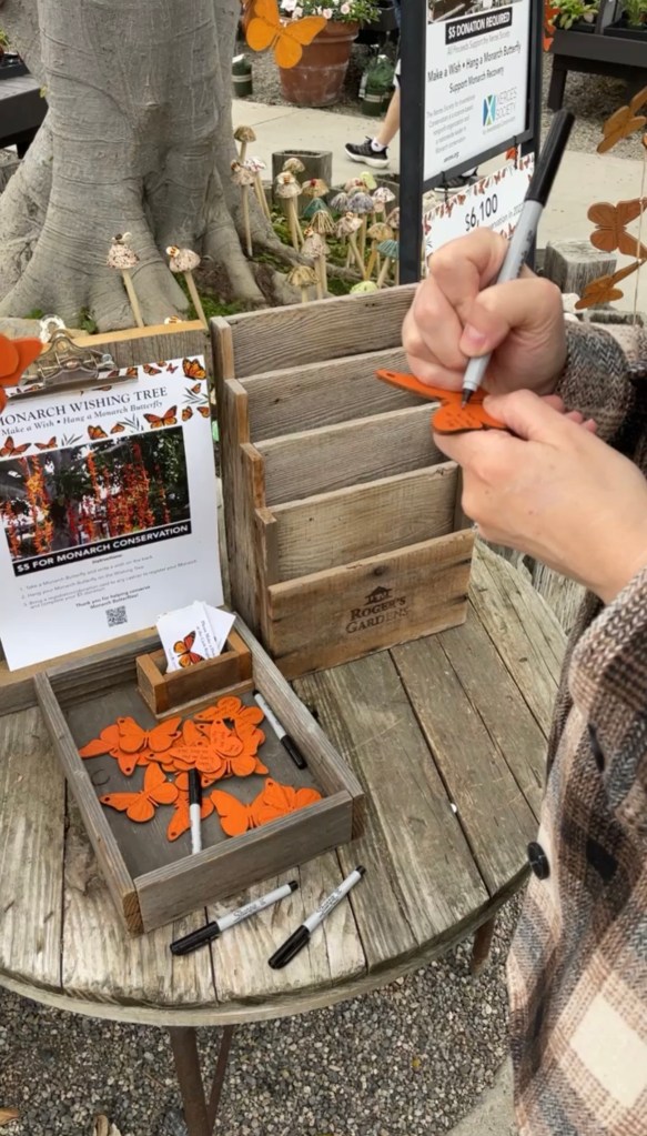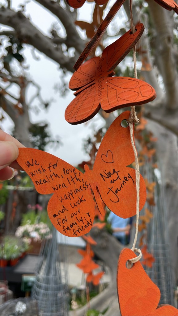 Roger’s Gardens is a family owned home and garden wonderland in Newport Beach, California. The grounds are filled with flowers, trees, plants, fountains, pottery and buildings that house more plants, furnishings and collectables. It’s like a huge indoor/outdoor gift shop with the cutest, unique stuff. From books to candles to cards to perfume, I wanted everything!!!! You can walk the grounds for hours just looking at the scenery and shopping. There are stations where you make your own arrangements, pot your own plants, and my favorite- a butterfly tree, where you write a wish on a wooden butterfly and tie it to the tree.