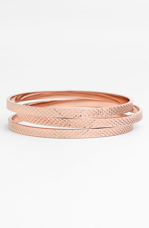 Large cream bangle with rose trim, rose metal bracelet and fitted cream cuff with rose toggle closure all available at H&M, Michael Kors watch available at Nordstrom and thin bangle set available at Aldo. I don’t recall exact prices but I do know the bracelets were ALL under $10 and they are in stores now.