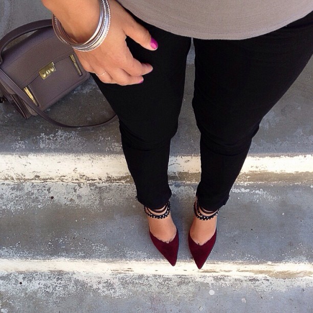 28 OctToday’s outfit of the day(actually last Friday’s) is one of my go-to Fall looks- skinny jeans worn with a blazer & cute top and sexy heels. In this case I wore a peplum top and my favorite strappy oxblood heels! This outfit is of course a high-low mashup because I just don’t like it any other way! Although I love my designer duds, It is a RARE occasion that I wear 100% designer because I love to mix it up! I almost always have something from Target, H&M or Forever21 in my ensembles. I’m also quite aware that many fashionistas are on budgets and I really love knowing that my readers can always afford something from my OOTD posts!