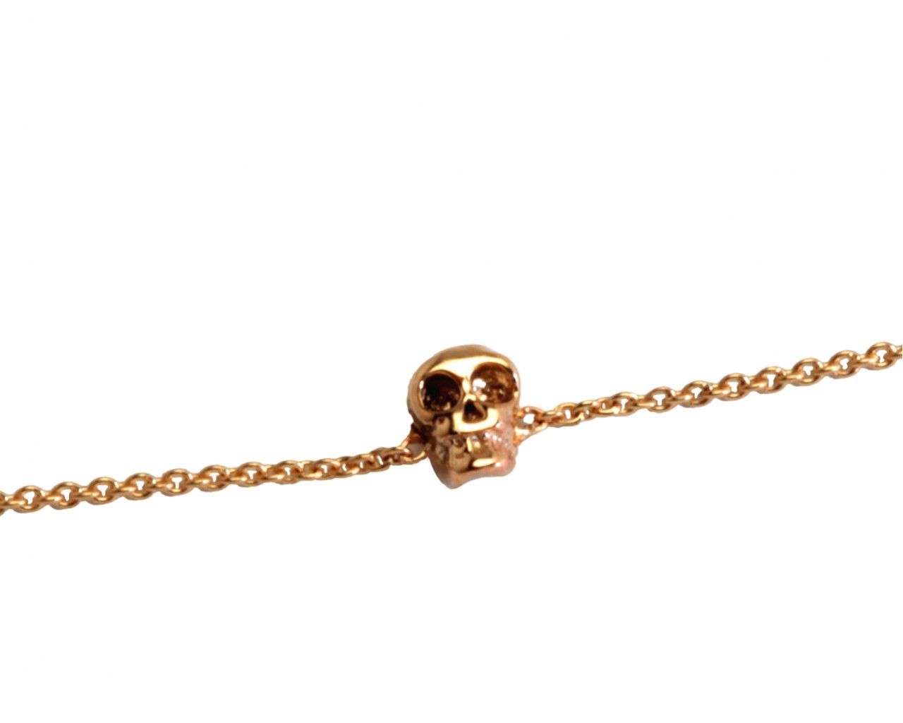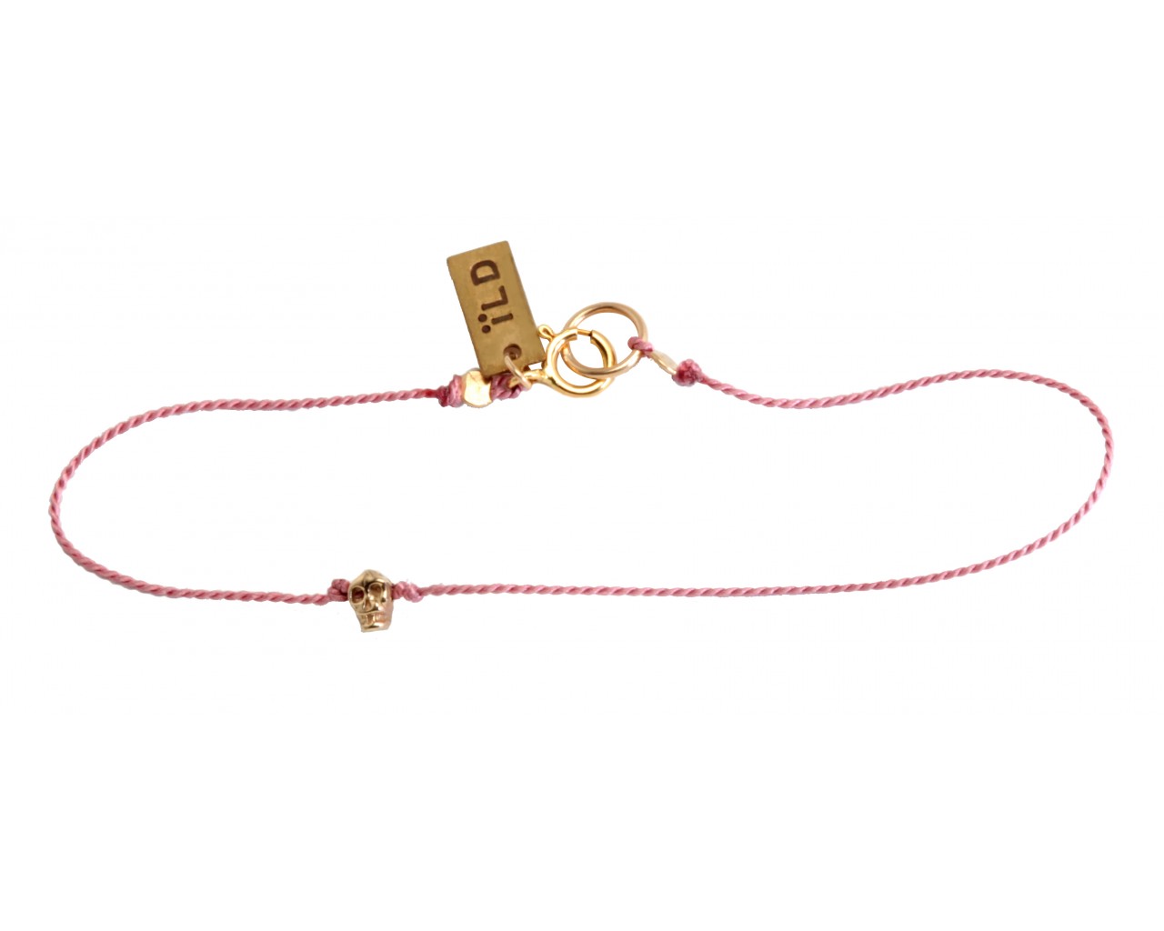 Shop these dainty bracelets at Iwona Ludyga Designs. 14k skull on chain bracelet with diamond eyes ($290) or without diamonds ($245).On a silk cord without diamond eyes ($90).