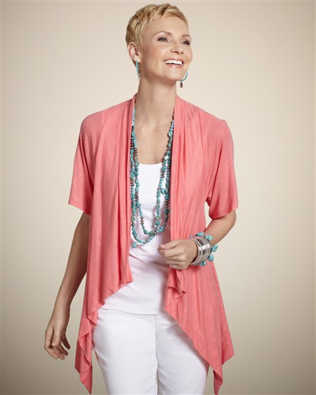White embroidered tunic($99), pink flowy open front cardigan($65), Tan cropped pant($75) and Salmon button up($69) all available at Chicos.