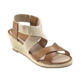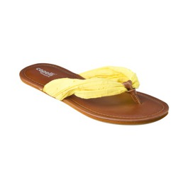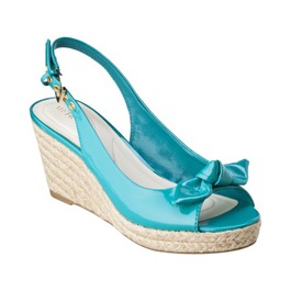 Cream peep toe wedge with cutout detail($25.48), peep toe wedge in cognac($24.99), red patent low heel pump($24.99), sand espadrille wedge with ankle wrap detail($24.99), Teal low wedge with bow detail($24.99), white thong with rhinestone detail($14.99) and yellow fabric thong($14.99) all available at Target.
